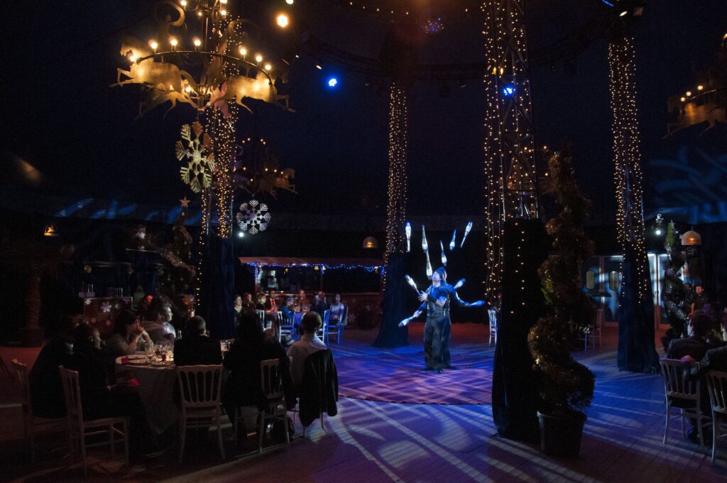- Décor Féerique : Toile bleu nuit, guirlandes scintillantes, lustres dorés en forme de cavalerie, ambiance chaleureuse et spectaculaire.