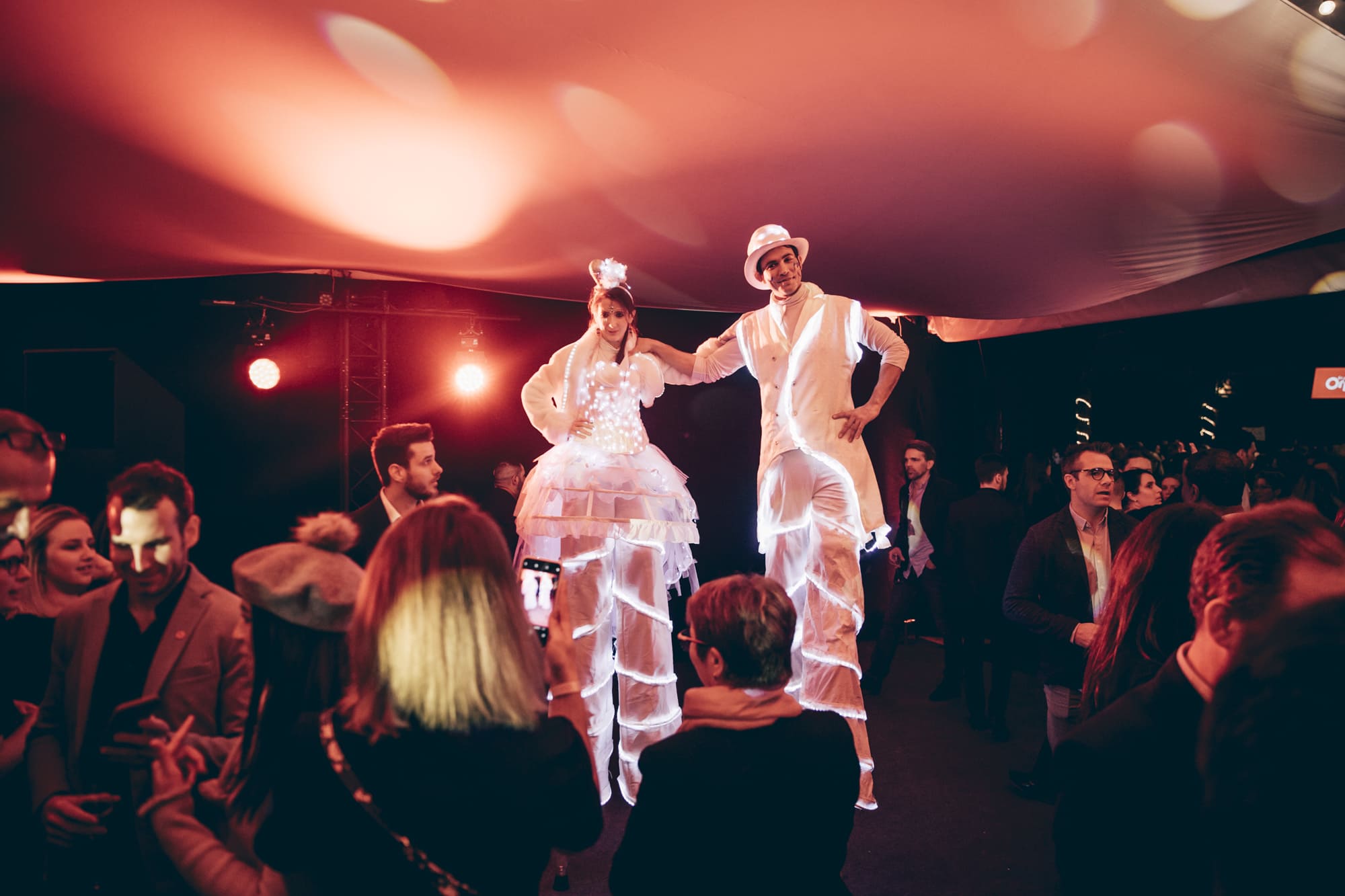 - Expérience Immersive : Les artistes investissent l’espace du sol au plafond pour prolonger la magie du cirque pendant votre cocktail, repas ou encore soirée dansante.
