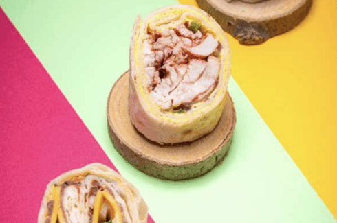 Escalope de poulet garnie de courgette, carotte, poivron vert et oignon rouge cuite vapeur, enrobée d’une sauce au curry vert, finition poivron vert