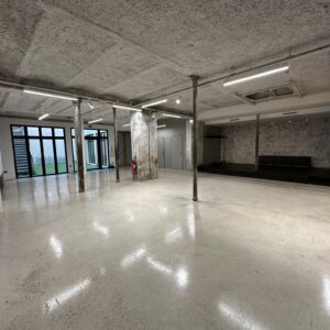 – Piliers en béton apparents structurant l’espace tout en préservant la modularité des configurations
