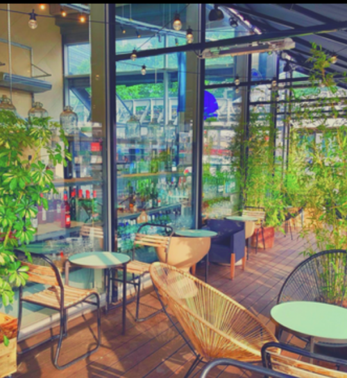 - deux espaces surélevés avec tables et canapés,