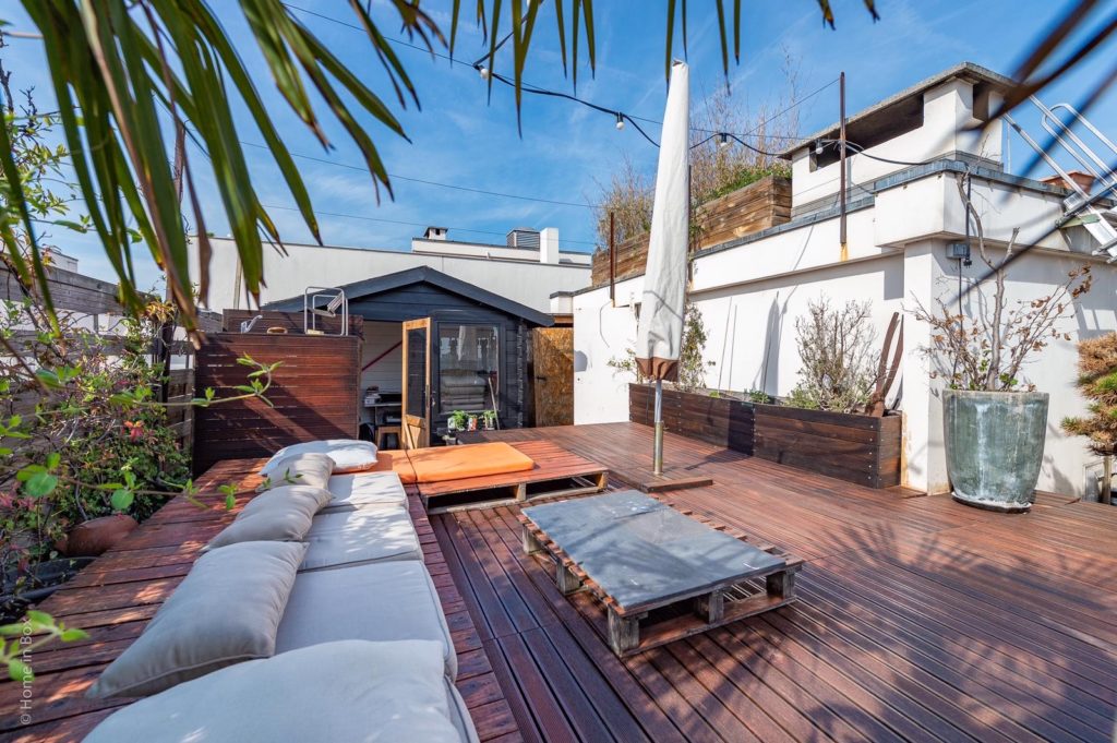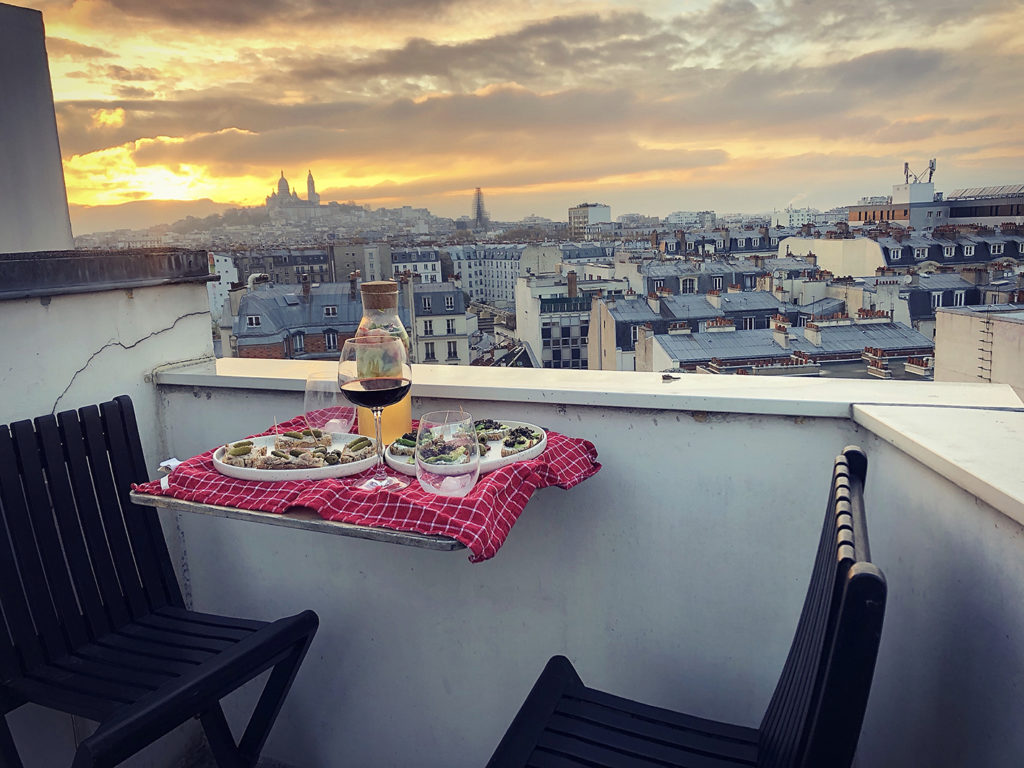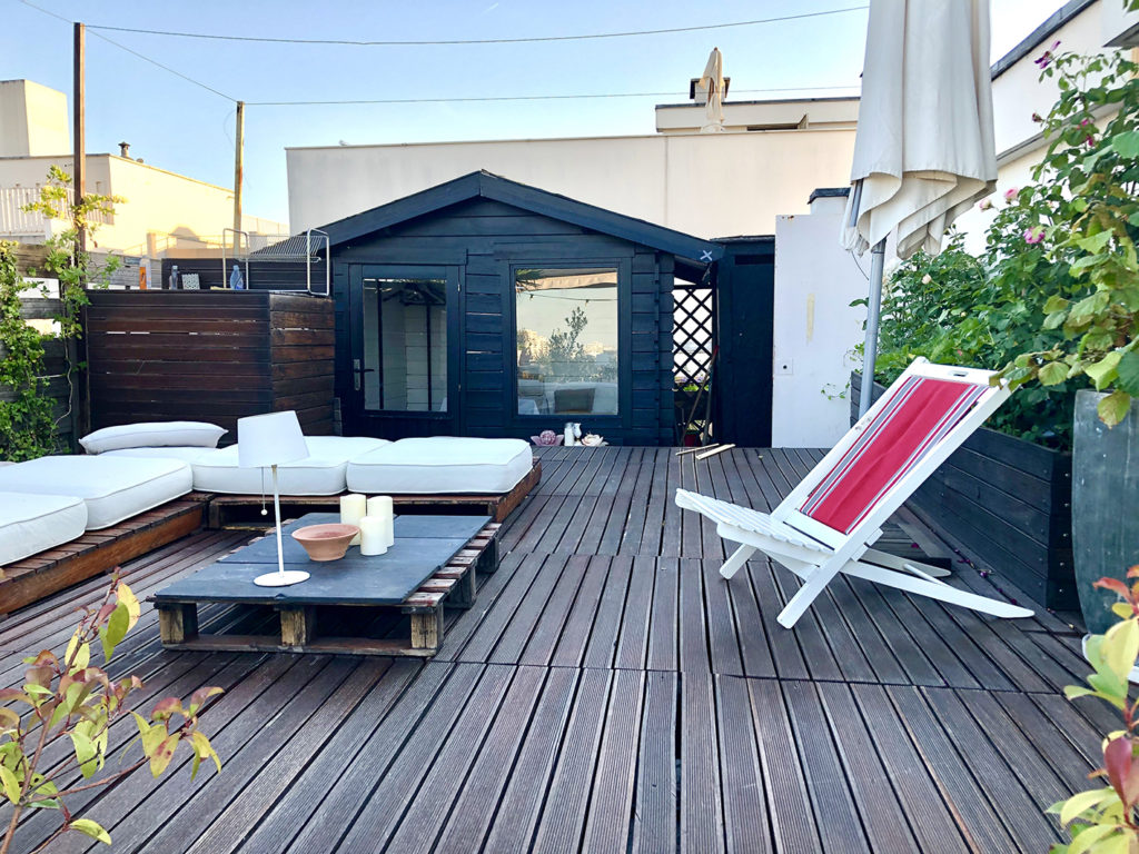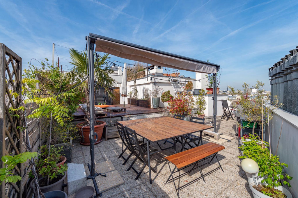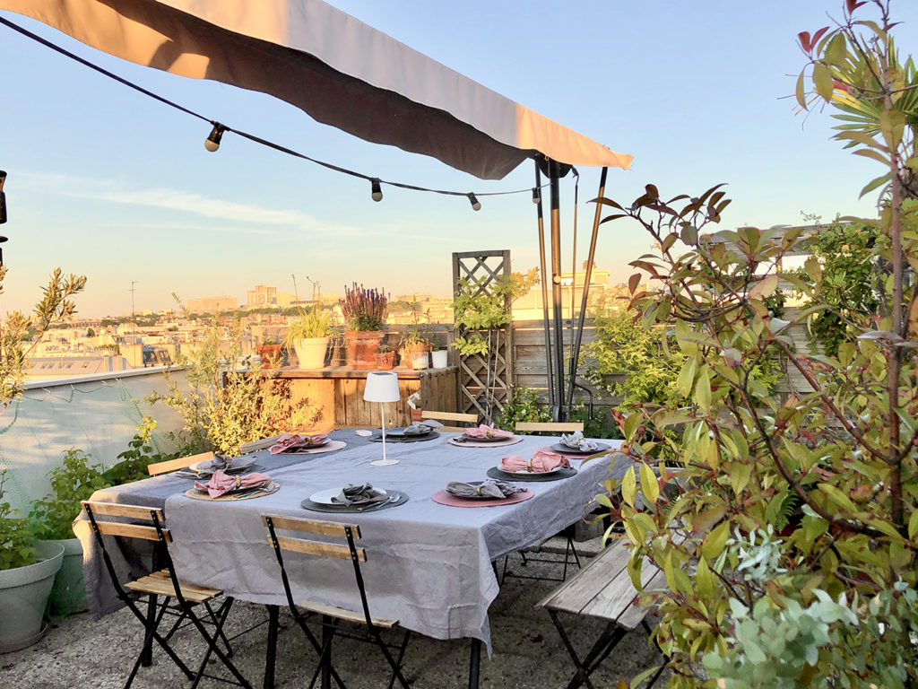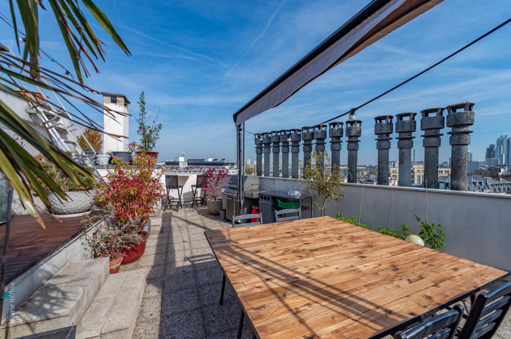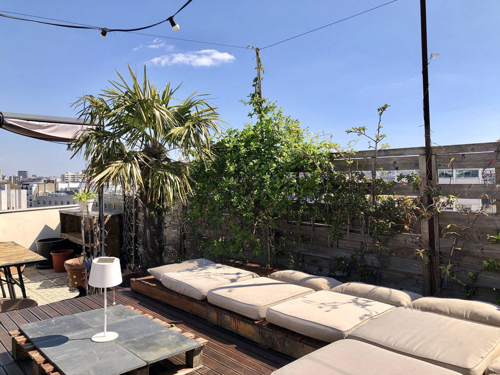Le rooftop de June offre une surface de 75 m2 et peut accueillir jusqu’à 30 personnes. On y retrouve un barbecue Weber de compétition, 2 tables pour des déjeuners ou dîners assis (maximum 12 personnes), un coin lounge pour se détendre en journée ou en soirée, le petit coin des amoureux pour observer le Sacré Cœur, le tout entouré de plantes et d’arbustes.