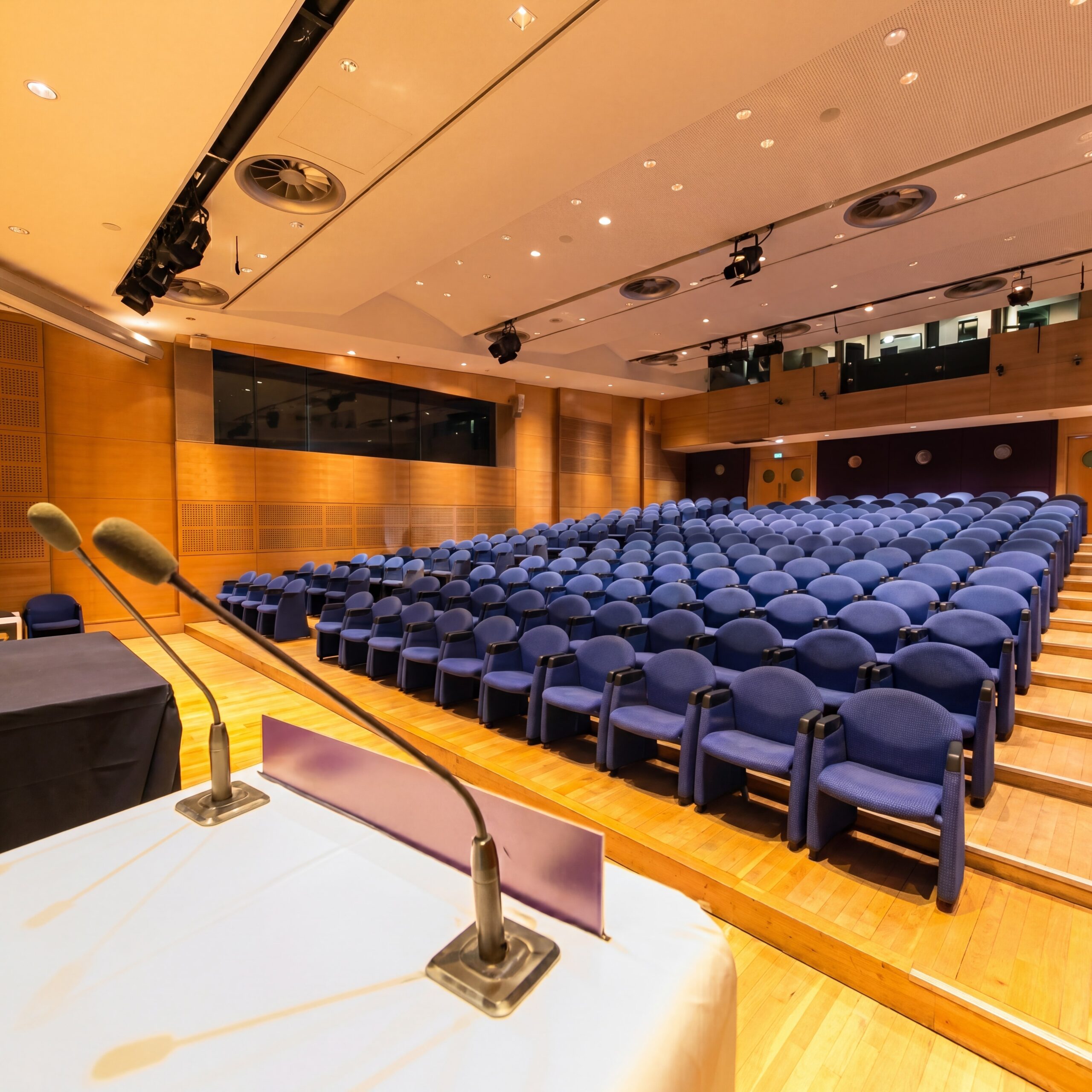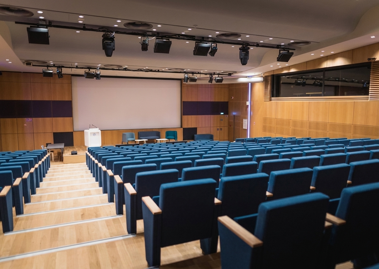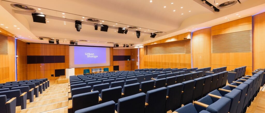 • L’Auditorium (258 places) : Un auditorium tout équipé avec matériel de projection et mobilier scénique — 258 personnes en théâtre, idéal pour conférences, colloques, conventions et spectacles