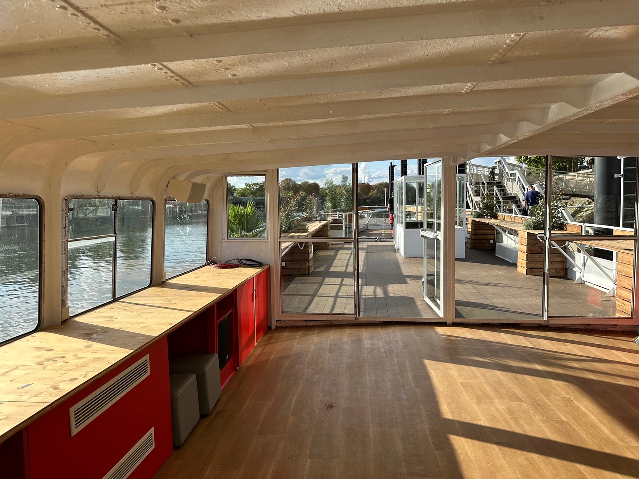 À bord, la péniche a bénéficié d’une modernisation complète : mobilier revisité, finitions soignées et aménagements pensés pour offrir un cadre chaleureux et fonctionnel, adapté aussi bien aux soirées festives qu’aux séminaires professionnels.