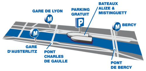 Situés au coeur de Paris, au pied de la Gare de Lyon, nos deux bateaux proposent un espace évènementiel naviguant de 600 m² et 350 m², ainsi qu’un espace privatisable à quai de 3000 m².