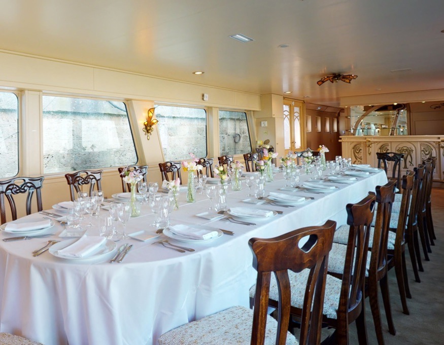 La bateau Maxim’s vous accueille dans un cadre prestigieux. Un pont soleil entièrement aménagés vous offre une vue exceptionnelle sur Notre-Dame.