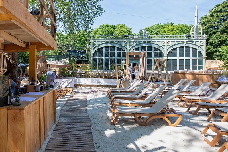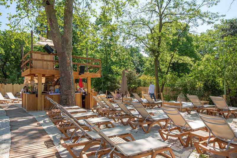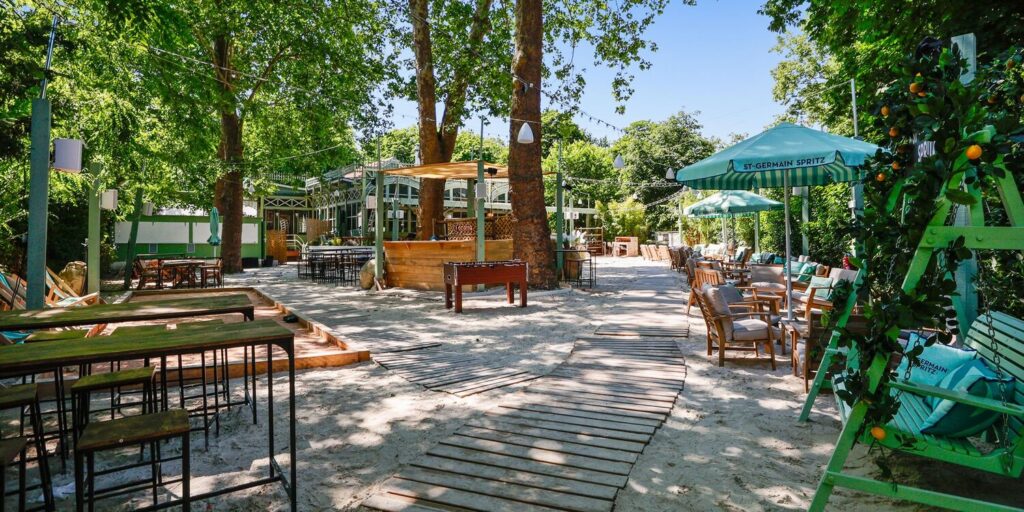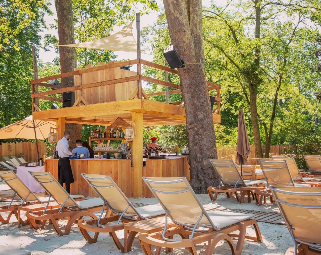 Sable doré, atmosphère bohème et décoration élégante composent un décor surprenant où transats, parasols, végétation et sable fin créent une ambiance balnéaire chic. Ce lieu en plein air séduit par sa convivialité et son esprit guinguette moderne, parfait pour oublier l’agitation de la ville.
