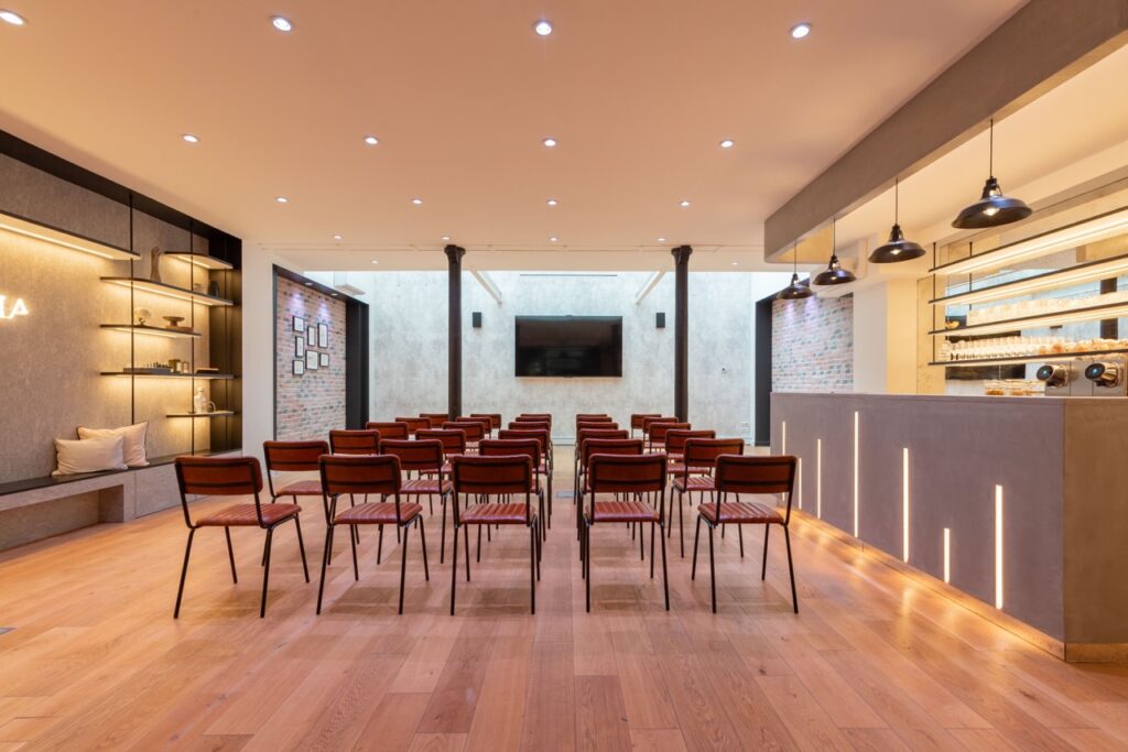 Cet espace de 130 m2, fusionne avec subtilité l’élégance contemporaine et l’authenticité des écuries d’antan.