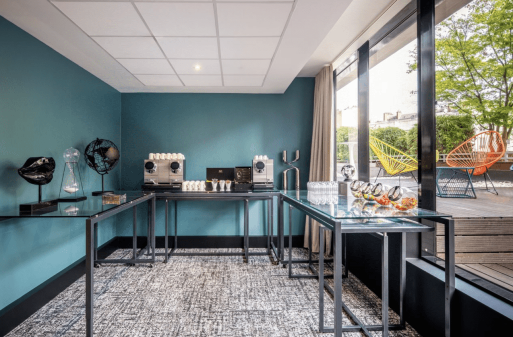 - Polyvalence des salles de réunion, conçues pour répondre à un grand nombre de besoins, des pauses sous forme de buffet aux repas debout tels que les buffets apéritifs. D’une capacité d’accueil de 120 convives en configuration cocktail et avec accès à une terrasse privée, nos espaces allient convivialité et intimité pour vos réunions.