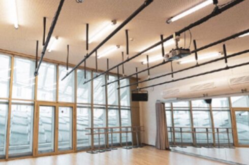 Le Studio 2 est d’une surface totale de 110m2, il dispose de panneaux acoustiques, de rideaux, et de miroirs. Il bénéficie d’une grande ouverture sur l’extérieur et s’impose d’une porte double-épaisseur.