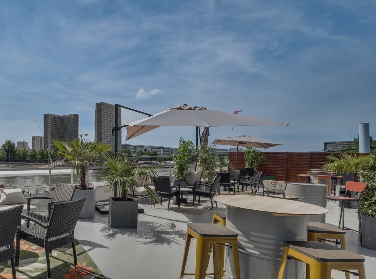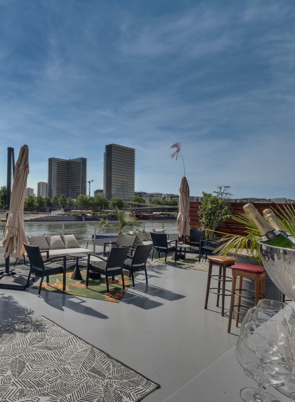 Privatisation Le Ponton. Le Ponton est amarré dans l’Est parisien, face à la BNF et bénéficie d’un parking privatif. Cet espace de 150 m2 entièrement vitré sur la Seine vous permet d’organiser vos événements. Son rooftop offre une vue magnifique sur la Seine. Cette péniche convivial est idéal pour vos événements comme des cocktails, dîner assis ou soirée d’entreprise.
