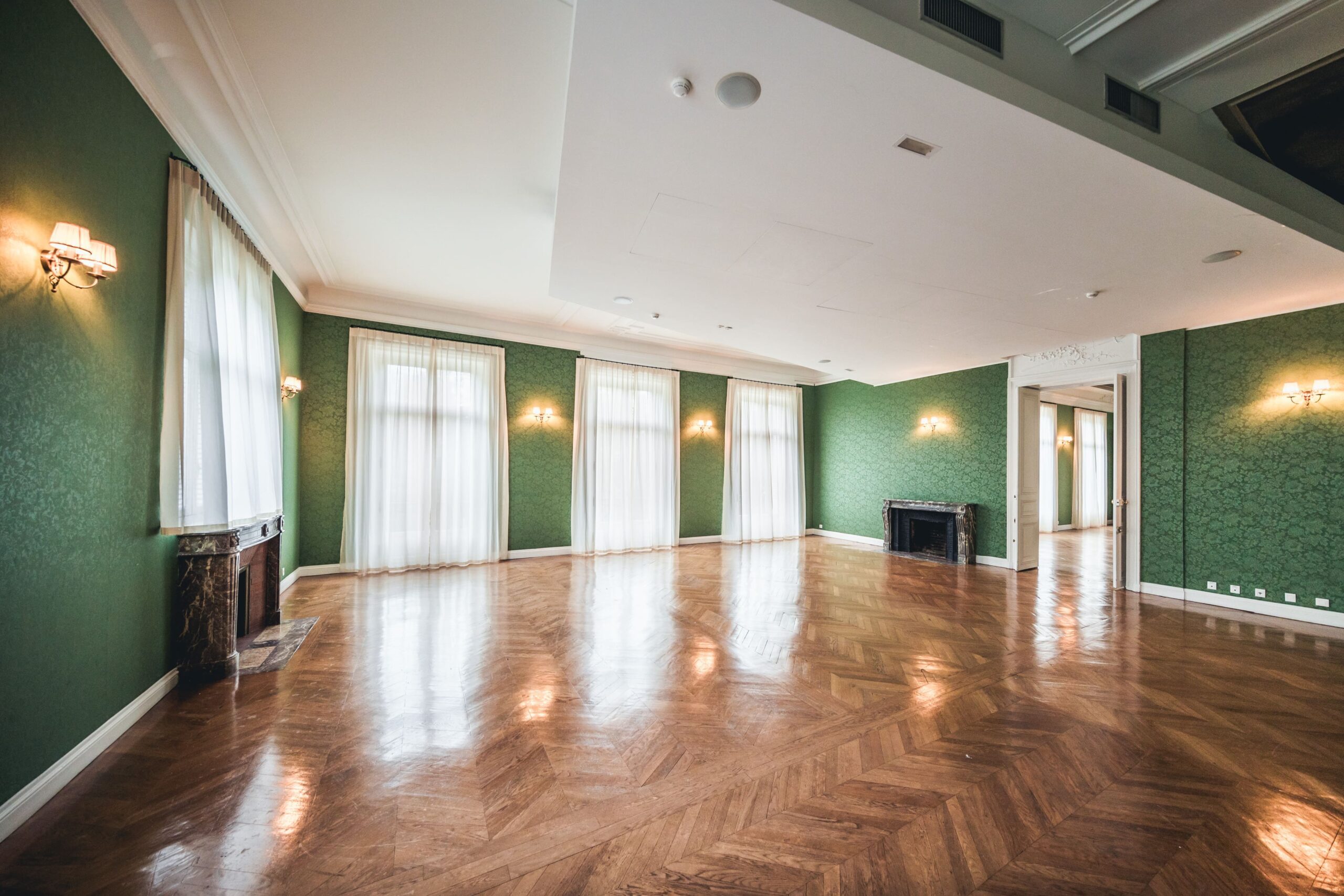 - La chambre d’Hélène (117m2) : Ancienne chambre de l’unique fille de la Baronne, cet espace a conservé les traces de son organisation d’origine à travers les orientations du parquet. Rénovée avec délicatesse, la salle allie équipements modernes et détails d’époque.