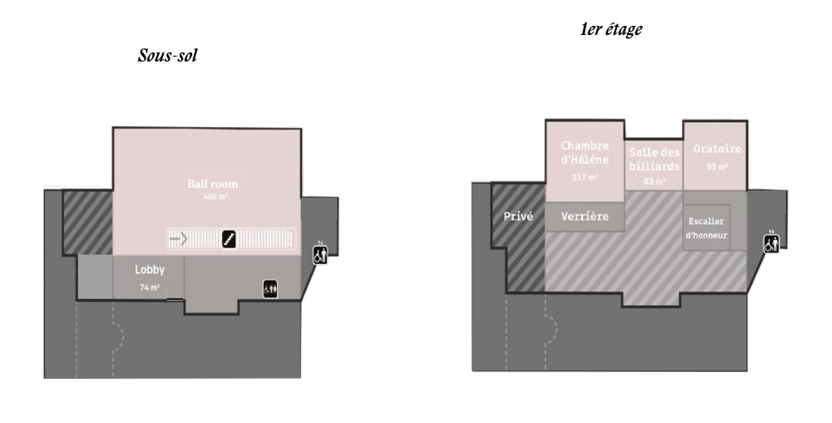 - La ballroom (486m2) : Cachée au sous-sol, la Ballroom est entièrement équipée pour tous les formats d’événements. Technologie de pointe, scène professionnelle, son et lumière : cet espace insoupçonné accueille vos conférences d’envergure et vos soirées festives les plus ambitieuses.