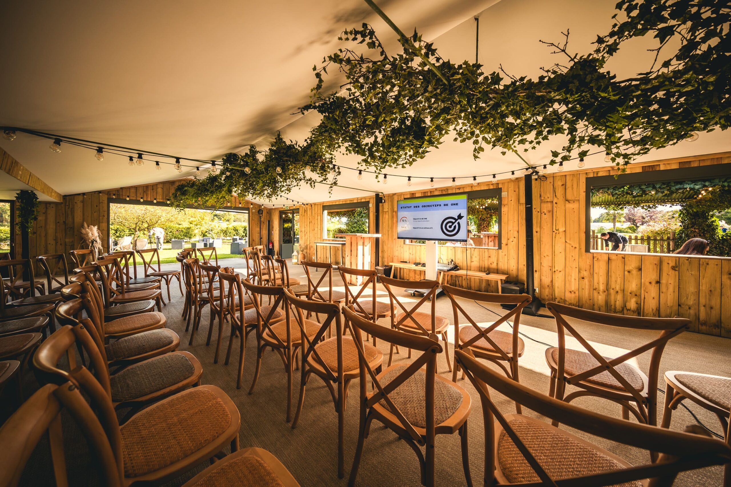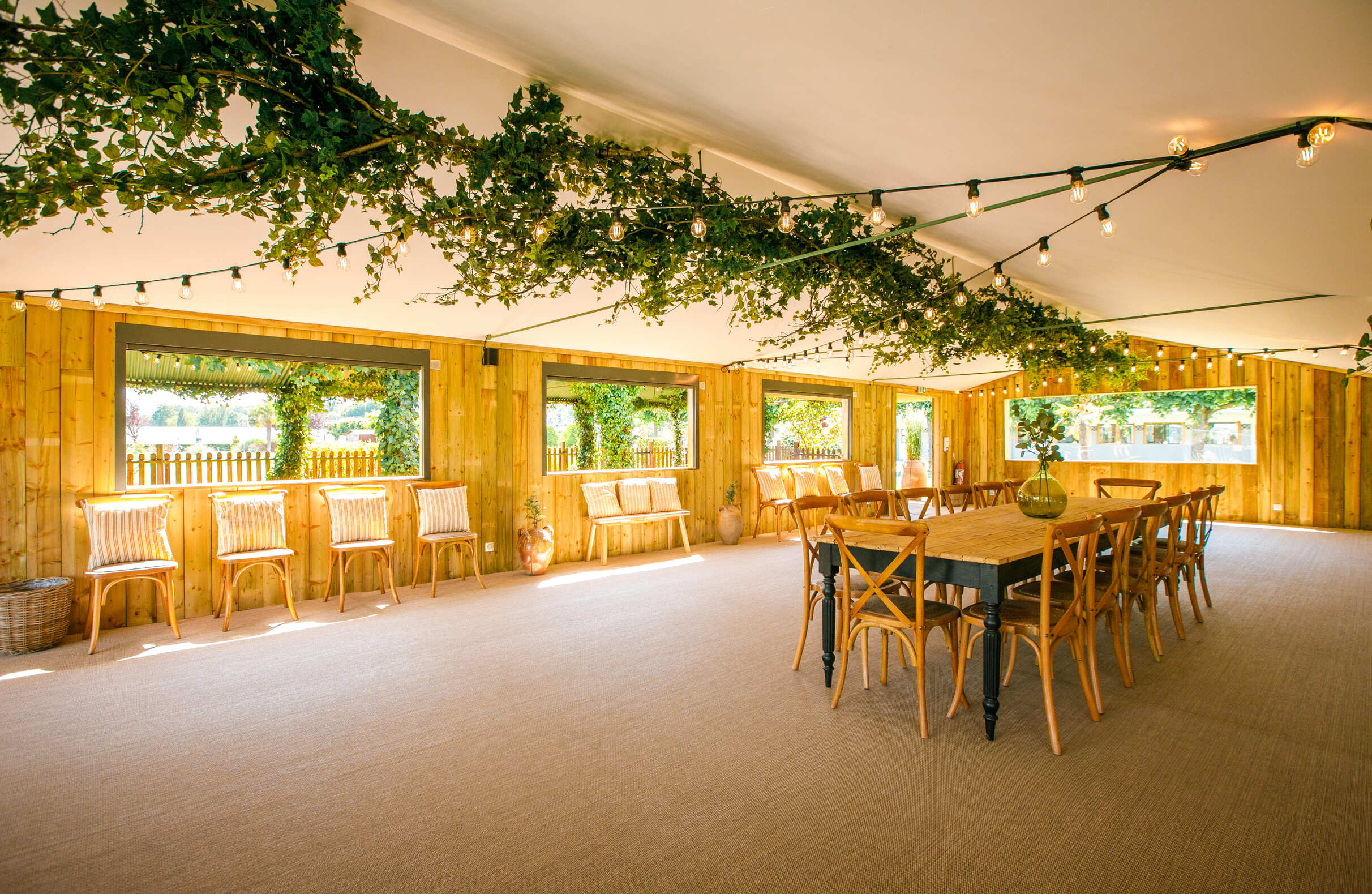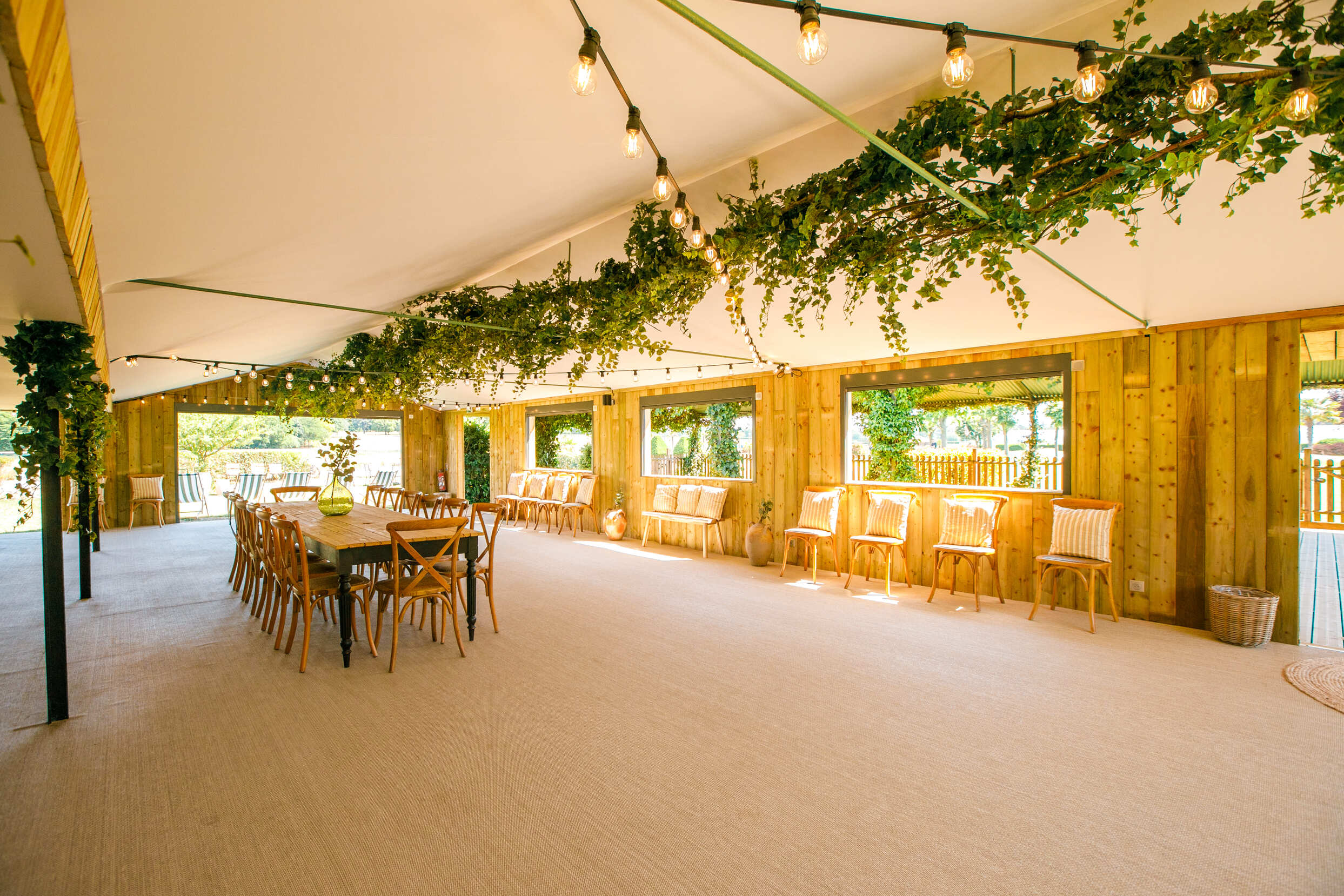 - L’espace Intérieur (170 m²) : Baigné de lumière grâce à l’ouverture sur le jardin. Bois et végétaux créent une ambiance réconfortante où matières naturelles et confort moderne se rencontrent. Cet espace accueille 150 personnes pour vos cocktails, 80 convives pour les repas, 80 participants pour les conférences.