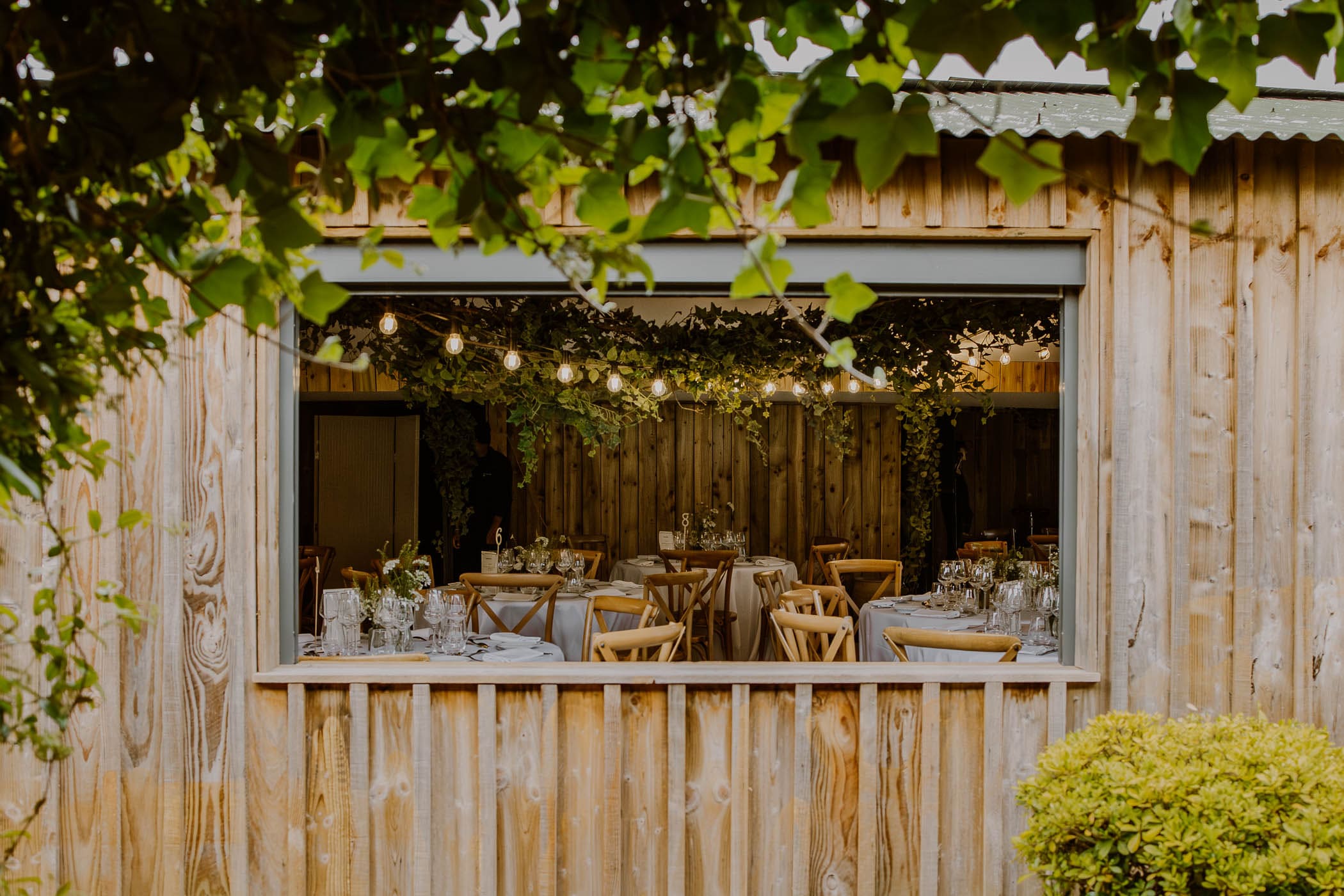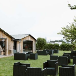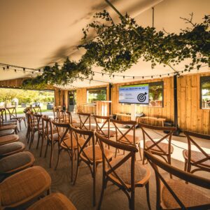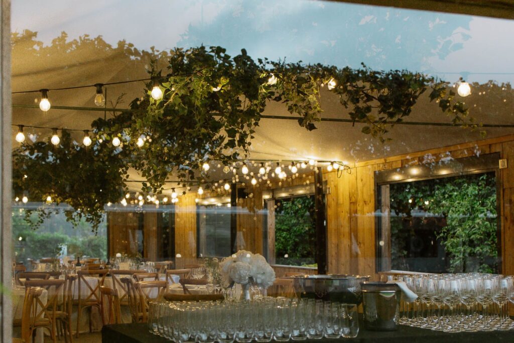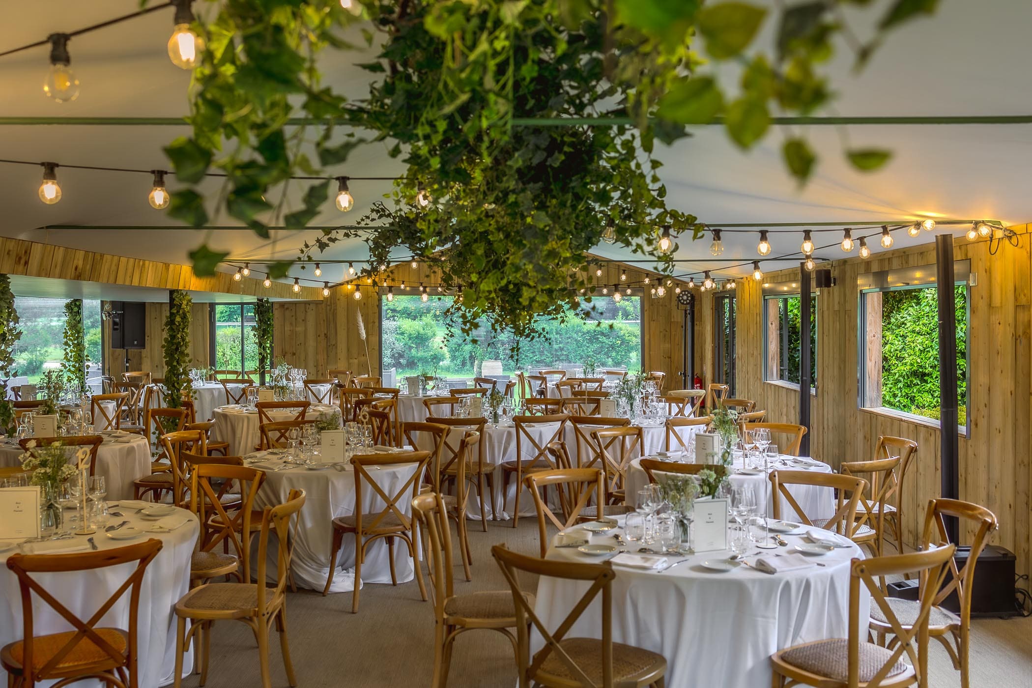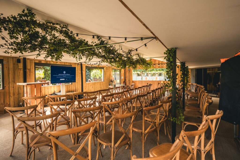 - L’espace Intérieur (170 m²) : Baigné de lumière grâce à l’ouverture sur le jardin. Bois et végétaux créent une ambiance réconfortante où matières naturelles et confort moderne se rencontrent. Cet espace accueille 150 personnes pour vos cocktails, 80 convives pour les repas, 80 participants pour les conférences.