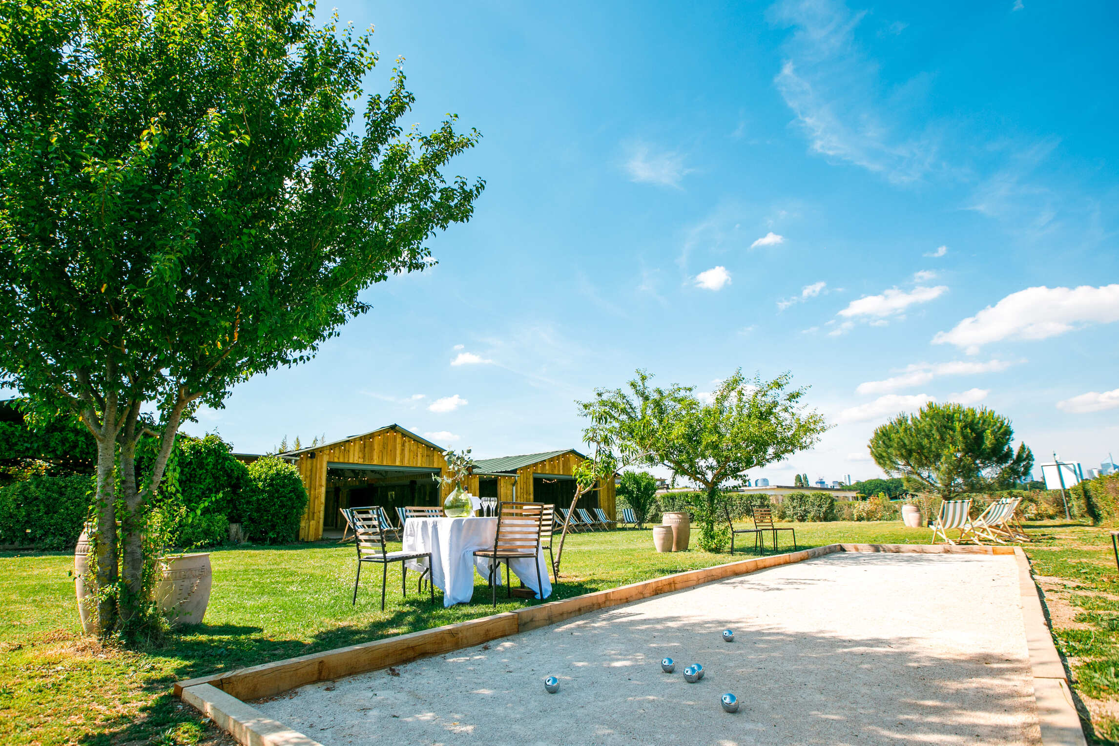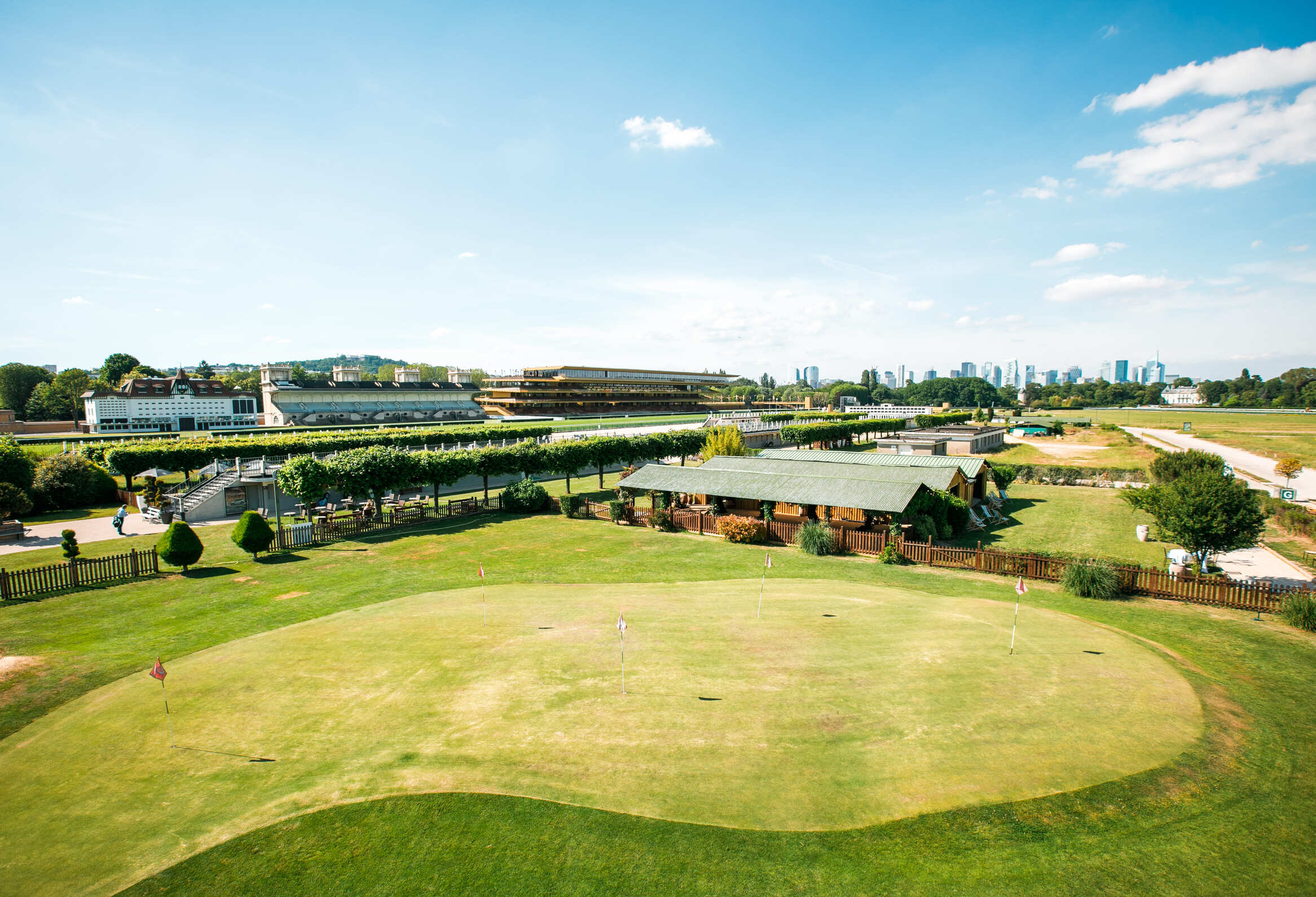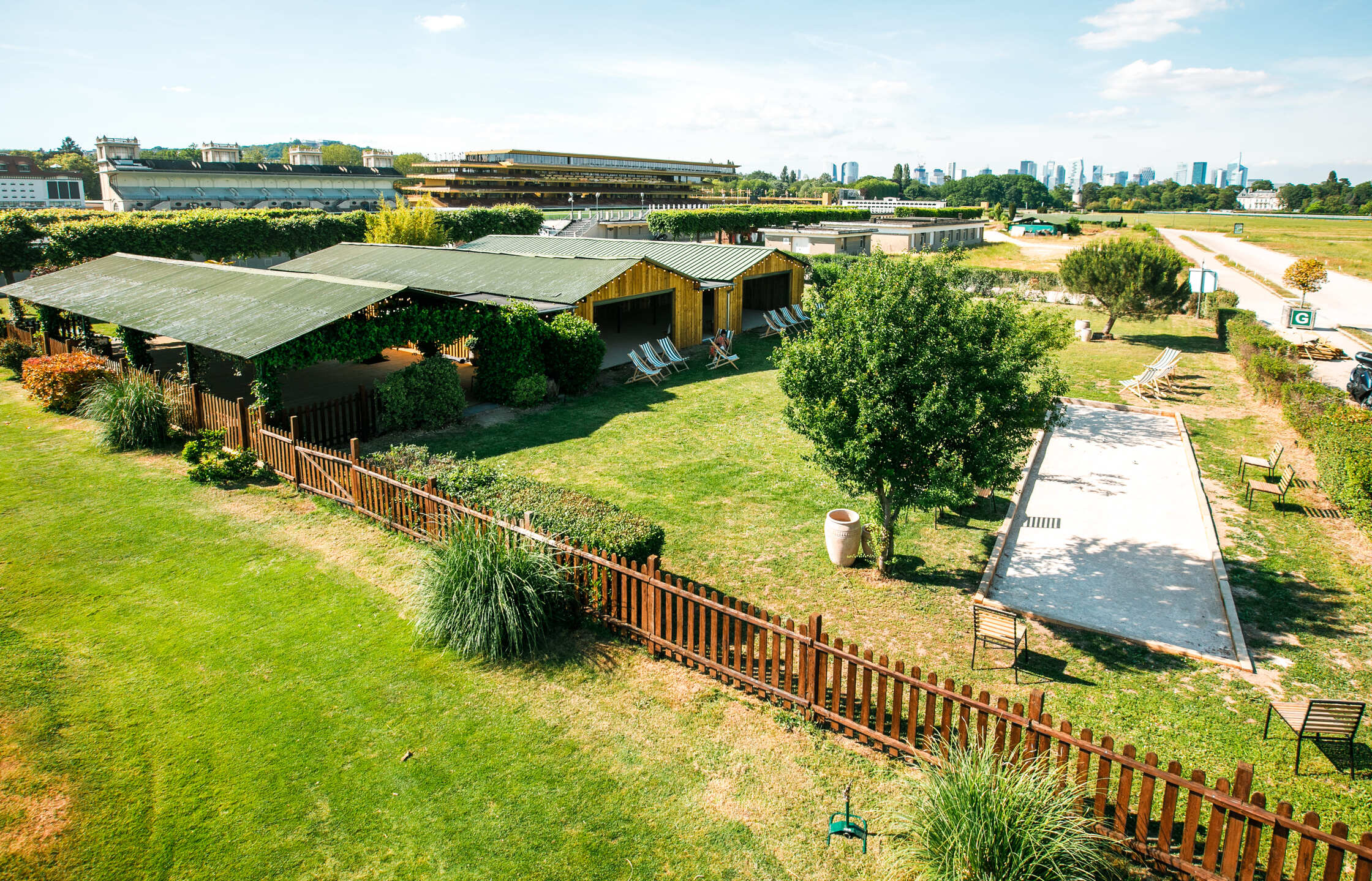- Le Jardin(360 m²) : Vos invités se retrouvent naturellement entre parties de pétanque, cocktails au soleil et conversations dans les zones lounges, le jardin devient le cœur battant de votre événement. Le panorama impressionne : vue circulaire sur les pistes de l’Hippodrome, La Défense à l’horizon et la Tour Eiffel qui s’élève au loin. Terrain de pétanque à disposition, parcours de golf disponible sur demande.
