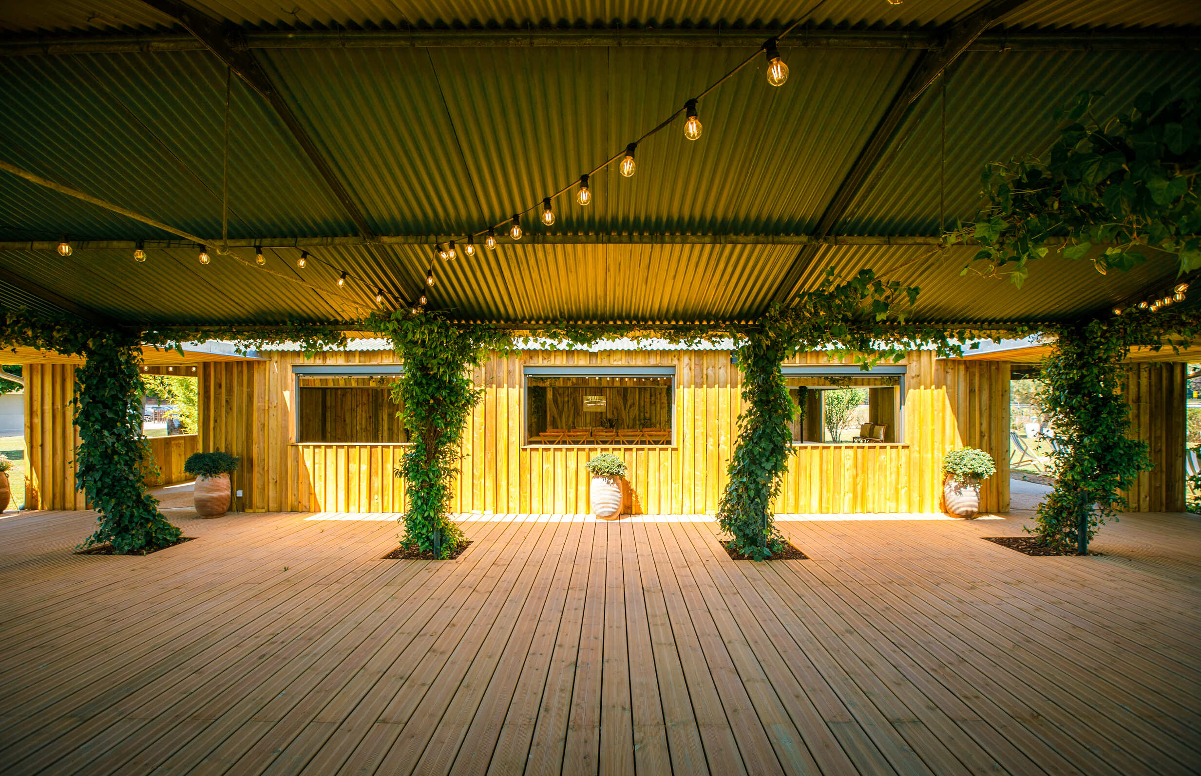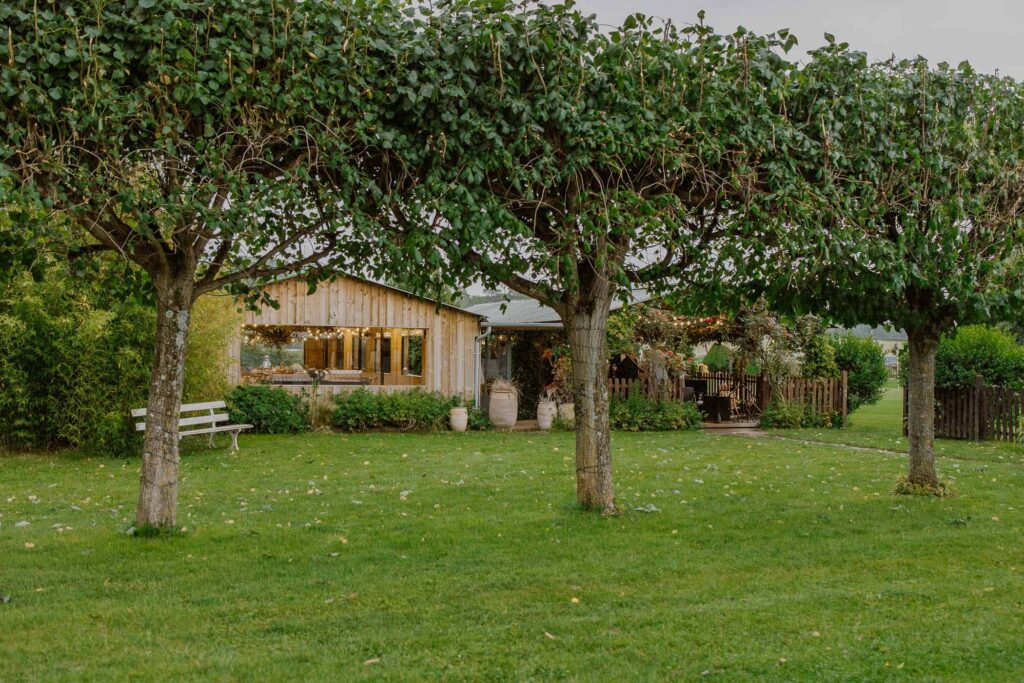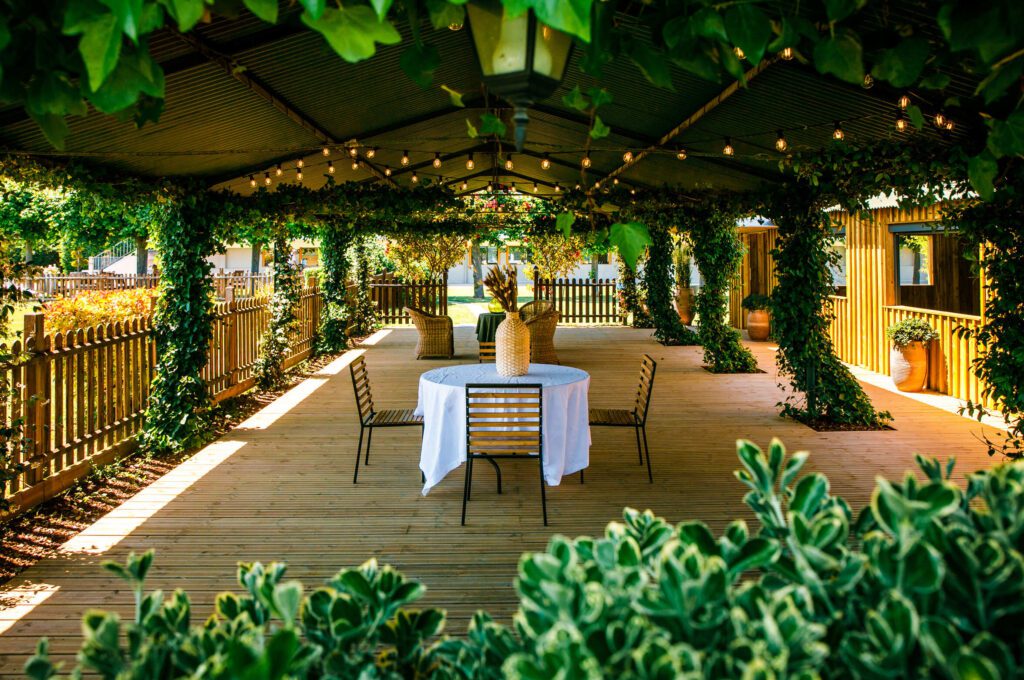 - La Terrasse Couverte (130 m²) : Terrasse abritée où la végétation apporte fraîcheur et intimité. Protection naturelle contre le soleil d’été, cet espace prolonge la cabane dans une atmosphère romantique et apaisée.