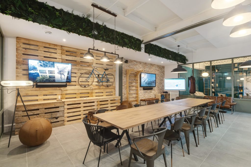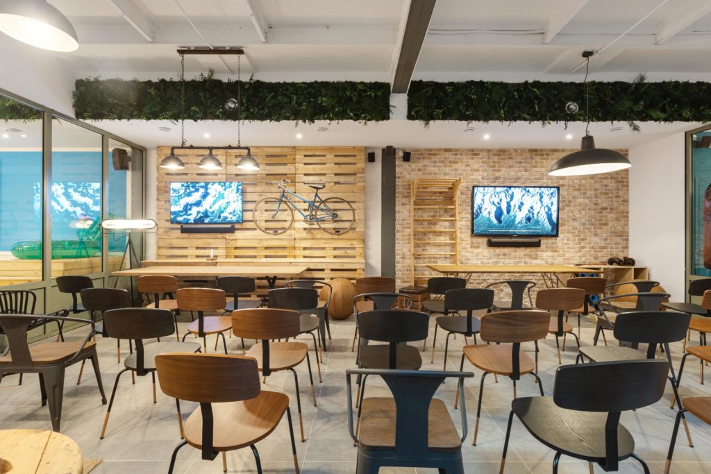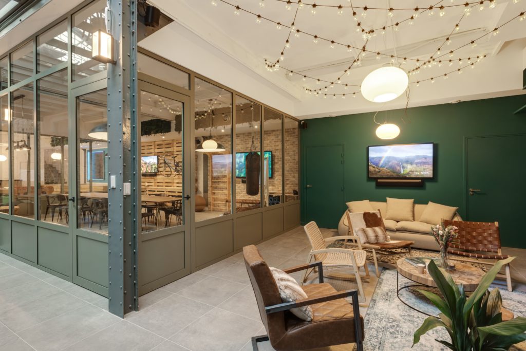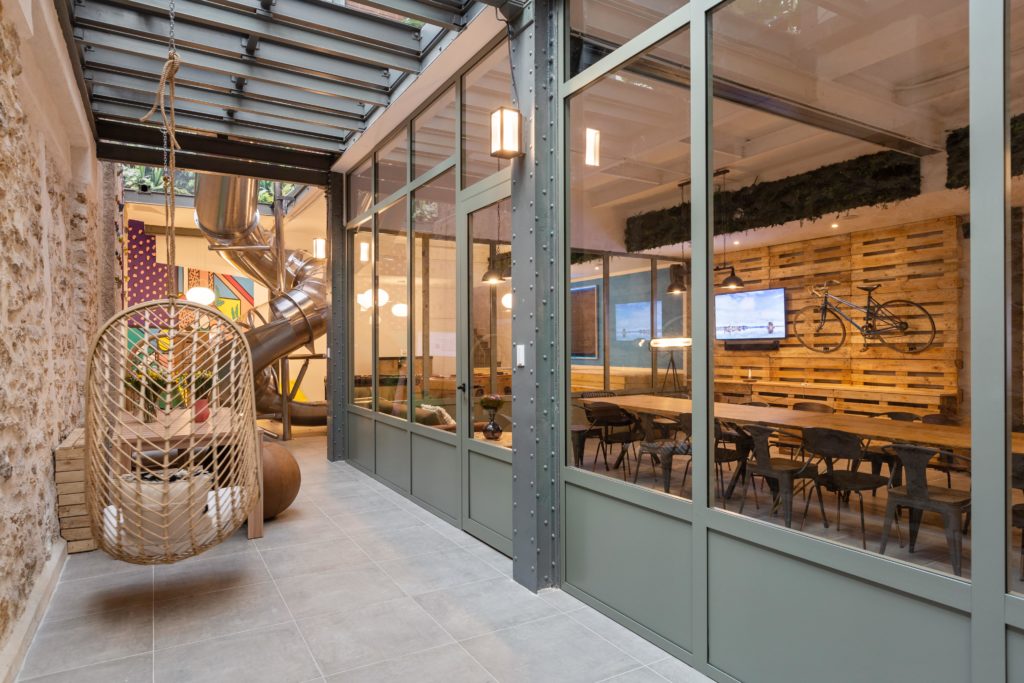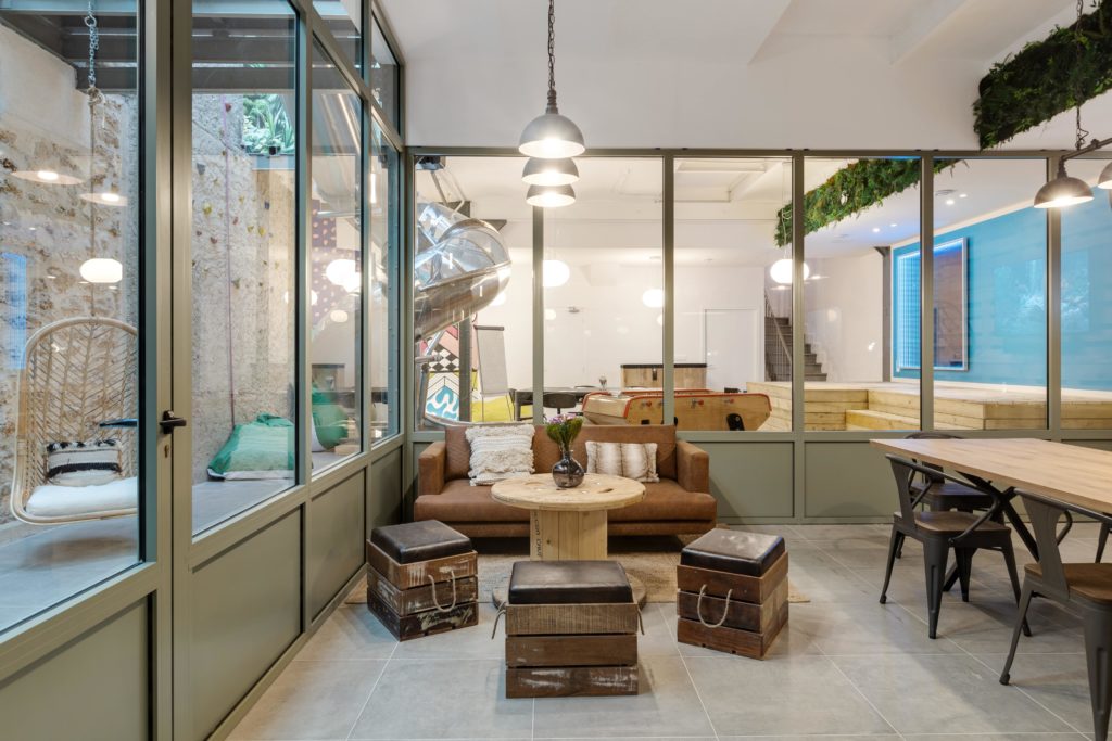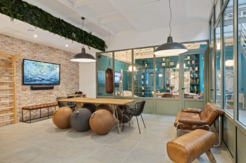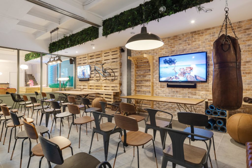 La Sportroom, chic et vintage, est équipée de tapis de yoga, d’un punching ball et d’un écran tactile. FabLab et SportRoom, séparés par une verrière escamotable peuvent accueillir des groupes de plus de 30 personnes.