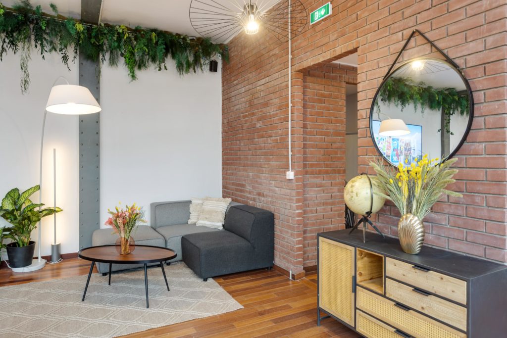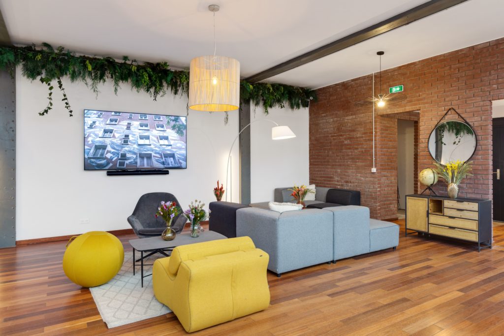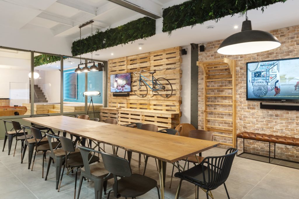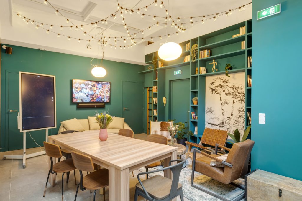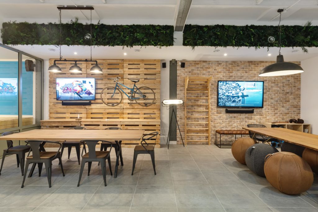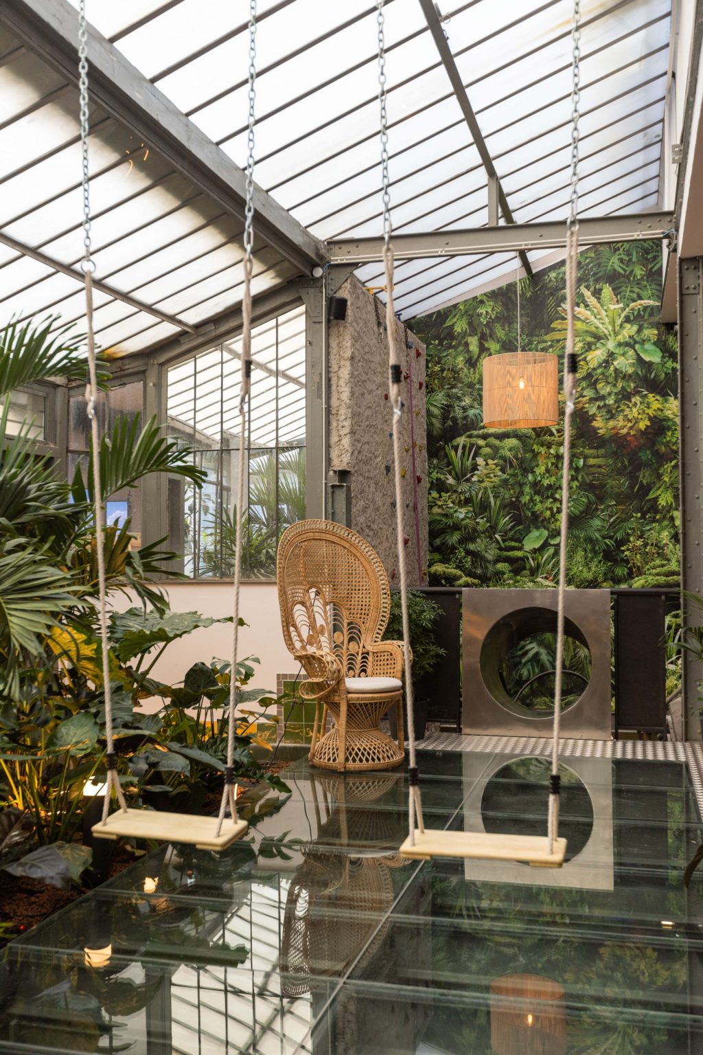 La Sportroom, chic et vintage, est équipée de tapis de yoga, d’un punching ball et d’un écran tactile. FabLab et SportRoom, séparés par une verrière escamotable peuvent accueillir des groupes de plus de 30 personnes.