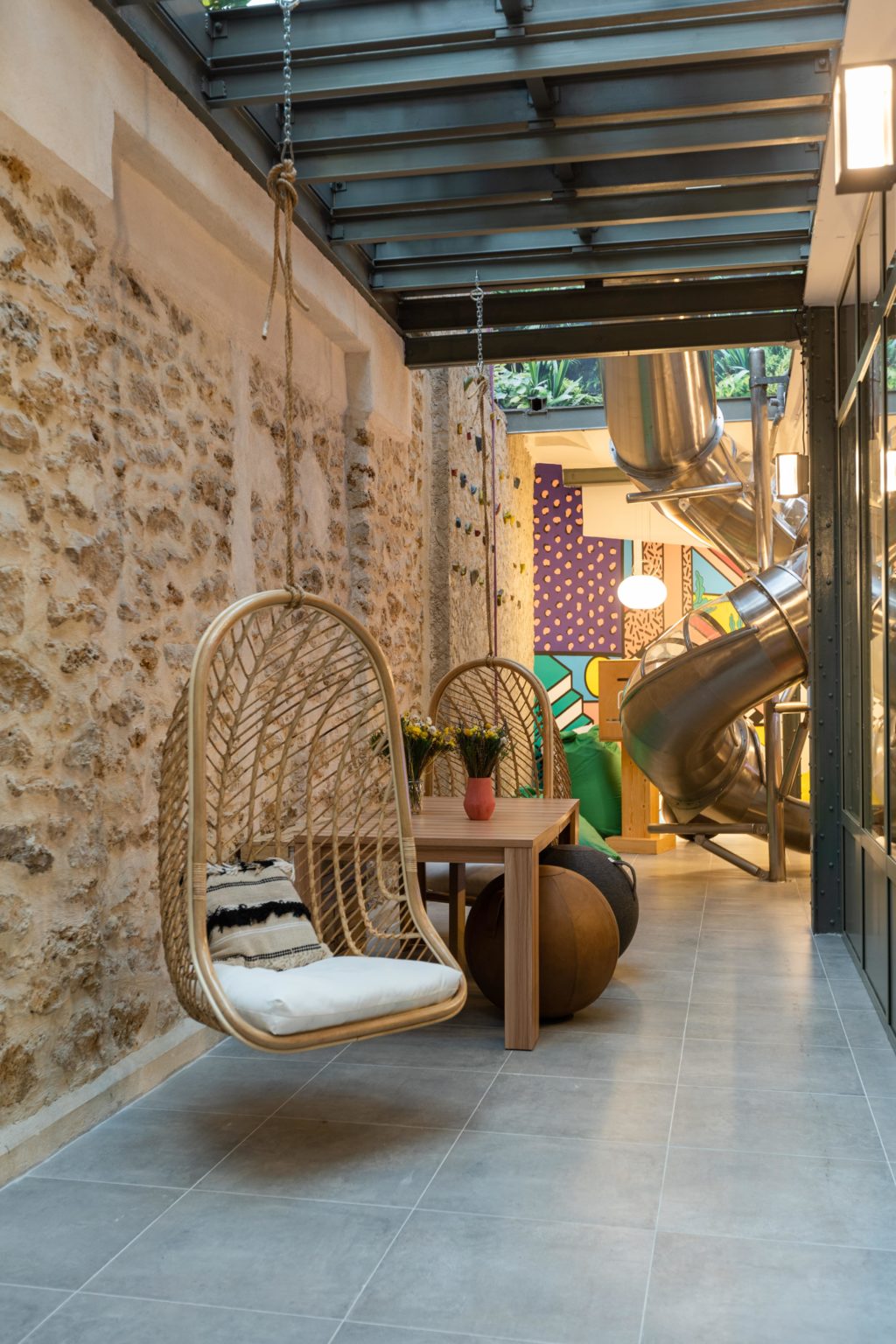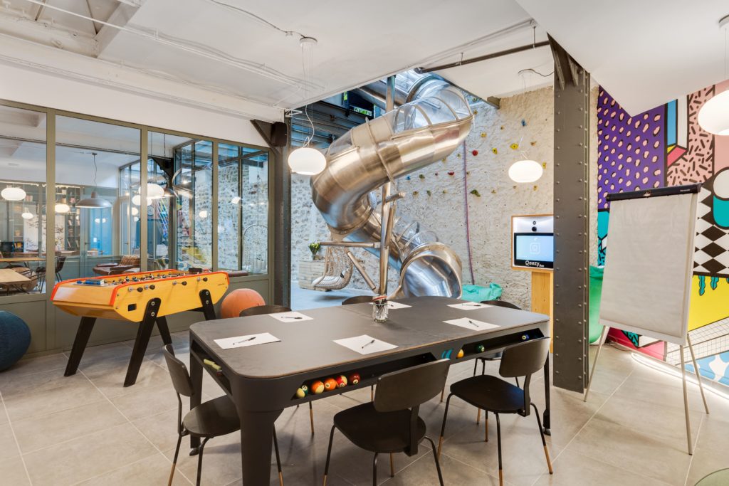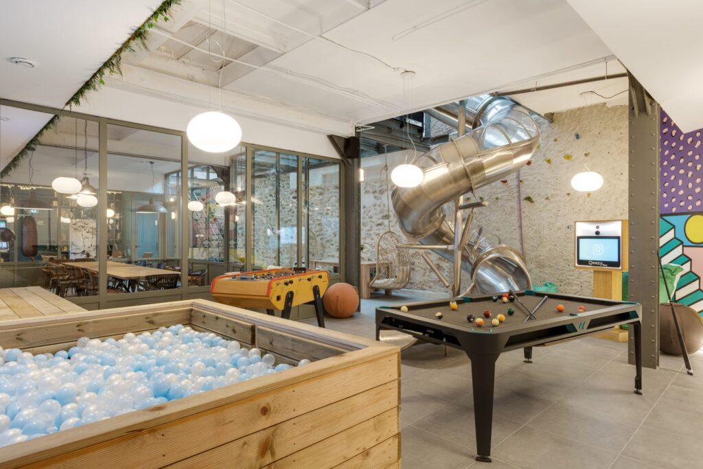 L’espace PlayGround à l’arrivée du toboggan est une salle de jeux équipée d’un babyfoot, d’un billard, d’une grande piscine à balles, un photobooth sur demande et un bar design.