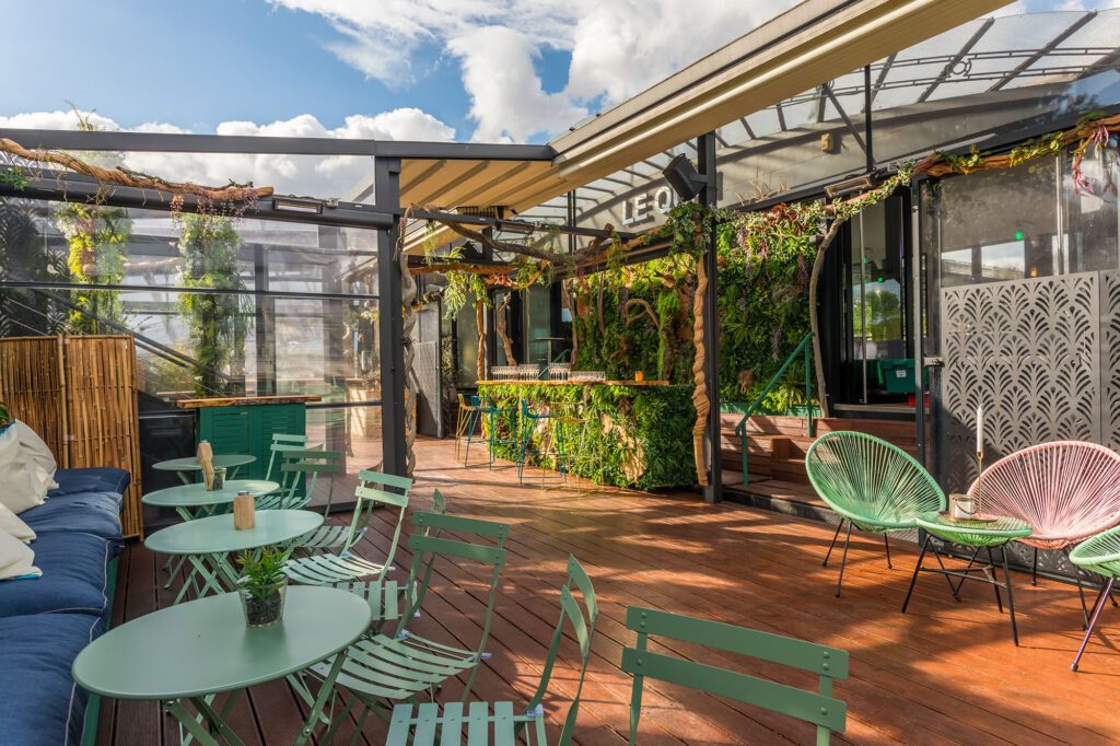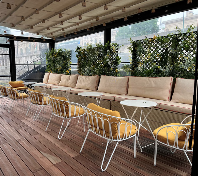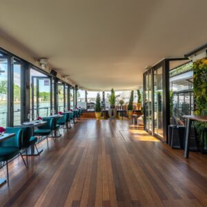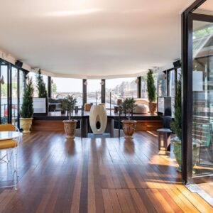 • Double espace unique : terrasse flottante méditerranéenne + péniche entièrement vitrée – Ambiance jardin d’été l’été, cocon chaleureux l’hiver