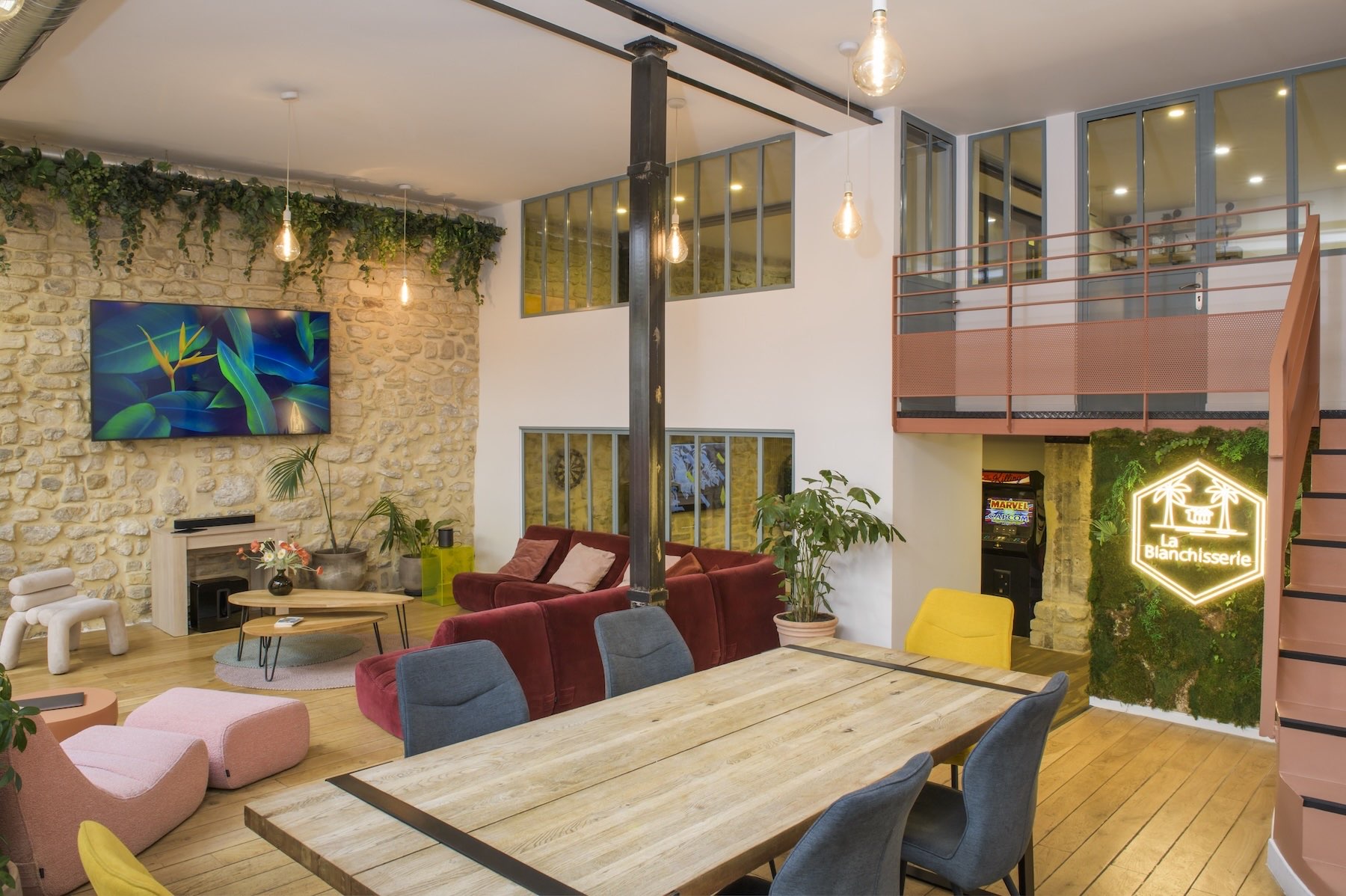 Composée de plusieurs salles thématiques et d’une cuisine moderne, La Blanchisserie permet de varier les formats de travail et de détente dans un décor au style affirmé et intimiste.