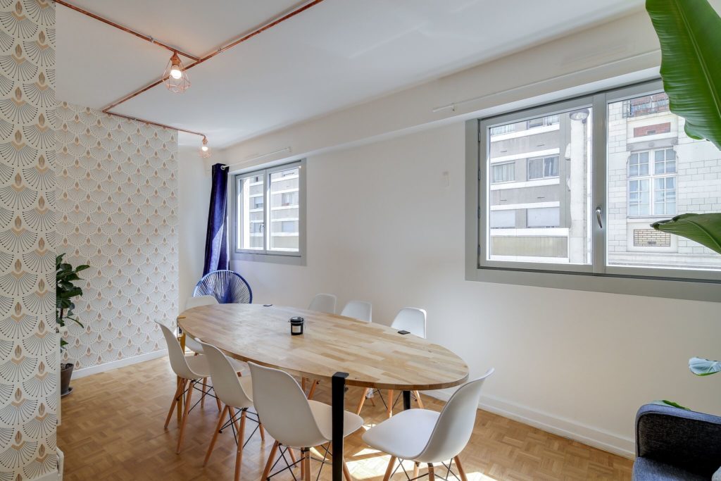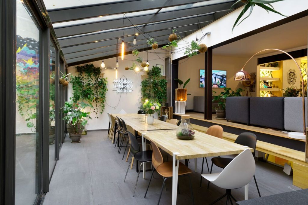 Concernant les capacités d’accueil selon la typologie de l’événement, vous accueillerez 70 personnes assises au RDC en format séminaire et 22 personnes autour d’une même table (modulable) sous la verrière.