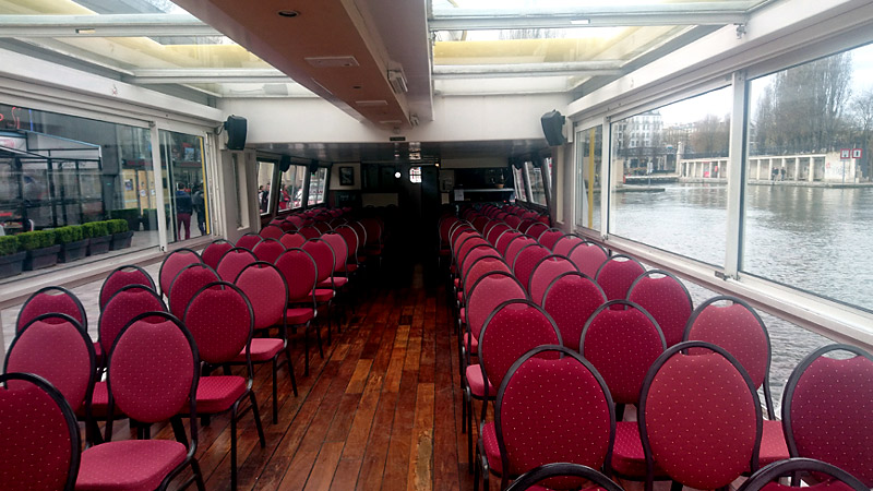 - Terrasse et Pont supérieur : La terrasse à l’avant du bateau et le pont supérieur aménagé de bancs latéraux offrent des espaces extérieurs supplémentaires pour profiter de la vue et de l’ambiance parisienne.