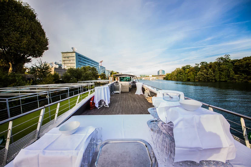 La péniche Evasion vous accueille à bord pour votre événement : mariage, anniversaire, séminaire, déjeuner ou dîner croisière. Oscillant entre modernité et décor précieux, cette magnifique péniche rappelle le charme de yachts. Accédez au magnifique pont terrasse afin de profiter de la croisière sur la Seine et des plus beaux monuments de Paris.