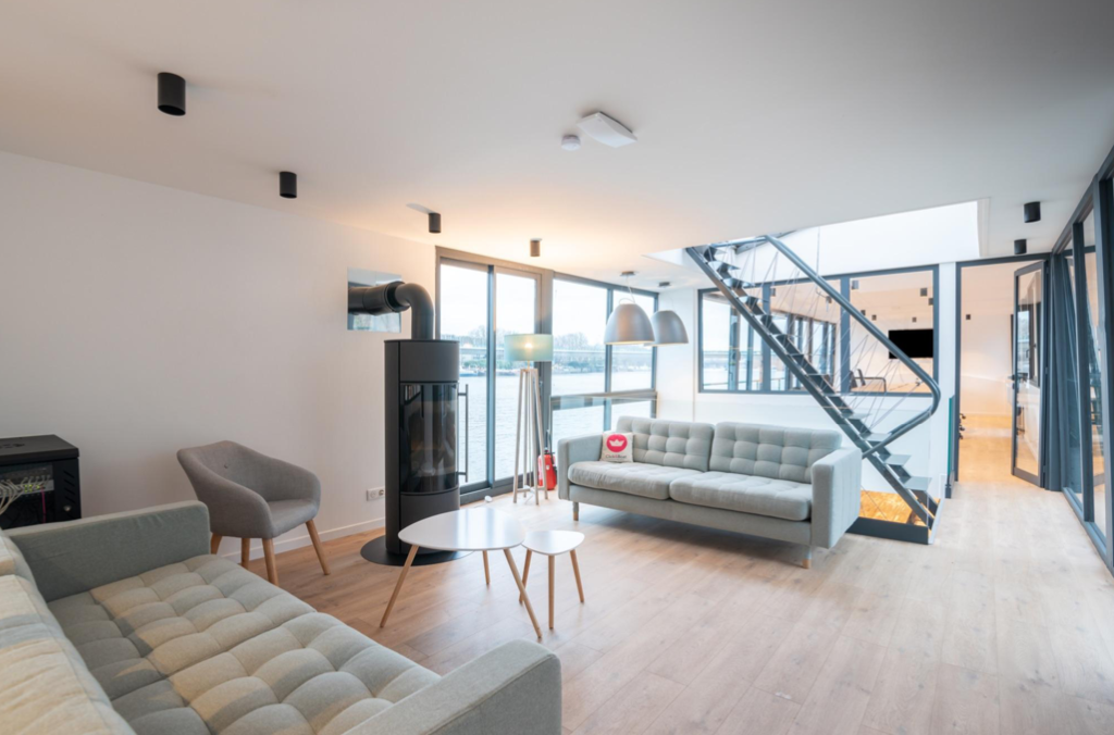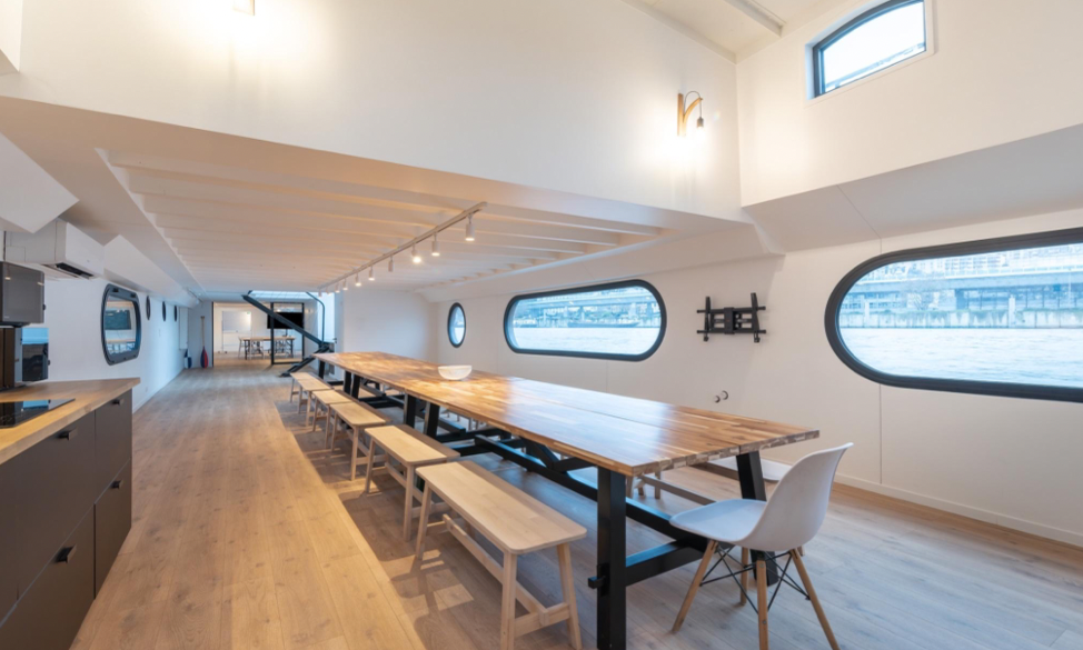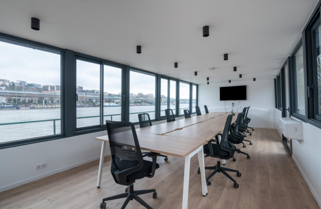 Privatisation Péniche Virtuose. La charmante péniche Virtuose totalement rénovée vous accueille sur le bras de la Seine à Boulogne, à quelques minutes de Paris 16ème ou de la Tour Eiffel. La péniche est divisé en deux espaces épurés au style moderne et industriel. Profiter d’un espace supérieur de 50 m2 dédié au Corporate avec une grande salle de réunion ainsi qu’un petit salon avec ces canapés. Le deuxième espace de 140 m2 est parfaitement adapté à des événements en journée comme en soirée pour vos événements privés ou professionnels. La péniche est très lumineuse avec ses grandes baies et hublots. Vous pourrez aussi profiter de la belle terrasse de 70 m2.