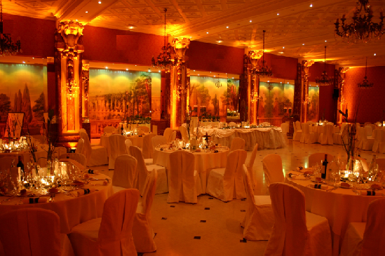 Le Salon Monceau, également situé au rez-de-chaussée offre une superficie de 320m² baignés dans une ambiance envoûtante, avec sa décoration baroque : plafond en caissons, colonnes en marbre rouge, lustres en bronze, tapisserie dans l’esprit XVIIIème et fresques romantiques. Capacité : de 50 à 450 personnes.